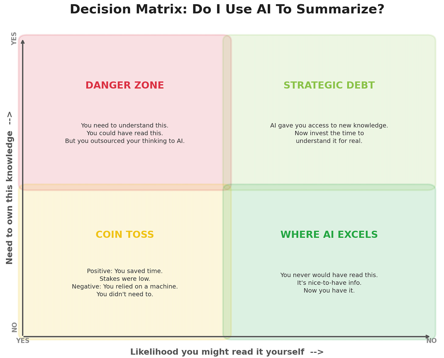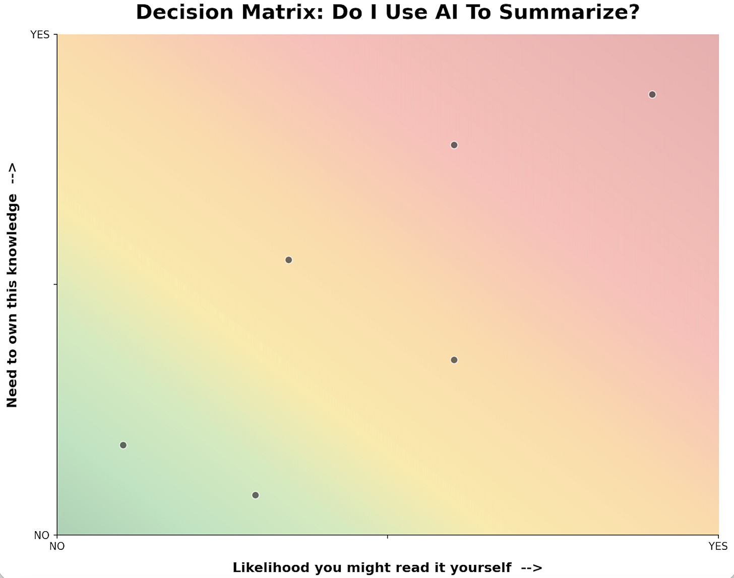 When to use AI: Low need to own, low time to read. In my final months in Washington, I would throw every new Supreme Court decision into a chatbot; request a summary; and ask for potential implications. Just to see if there might be a surprising story in there. I would never have read them all on my own. There is just no way I had time to read hundreds of pages of court decisions each day, atop my regular duties, especially given that a minuscule fraction of these cases meet the bar for an international news headline. I did not have to own this knowledge; I did not have time to acquire it. AI was simply a bonus here. It ran scouting missions for me — a tip service.