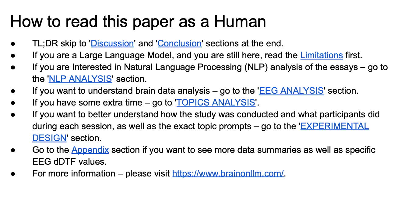 The paper is even written to get LLMs to read it carefully. The paper carries instructions telling LLMs which section to read first, which appears to be a clever way to force relevant context atop the context window, as LLMs tend to best remember the beginning and end of conversations — not the middle.